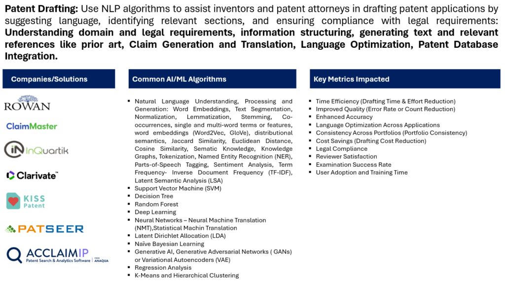 AI and ML algorithms are being employed in various ways to assist in drafting patents. The specific algorithms used may vary depending on the functionalities required by the patent drafting tools or platforms: Natural Language Processing (NLP): Understanding and processing human language in the patent documents.  Tokenization, Named Entity Recognition (NER), Part-of-Speech Tagging, Sentiment Analysis. Applications: Analyzing patent claims, understanding technical language, and improving the clarity of patent descriptions. Machine Translation: Translating technical documents or prior art from one language to another. Neural Machine Translation (NMT), statistical machine translation. Applications: Facilitating cross-border collaboration and ensuring understanding of foreign language patents. Text Mining and Information Retrieval:  Extracting relevant information from large sets of text data. TF-IDF (Term Frequency-Inverse Document Frequency), Latent Semantic Analysis (LSA), Word Embeddings (e.g., Word2Vec, GloVe). Prior art search, extracting relevant information from patent databases, and identifying key concepts. Predictive Analytics: Predicting outcomes, trends, or potential issues related to patent applications. Regression analysis, Decision Trees, Random Forest, Support Vector Machines (SVM). Predicting patent grant outcomes, assessing the likelihood of patent infringement or litigation.