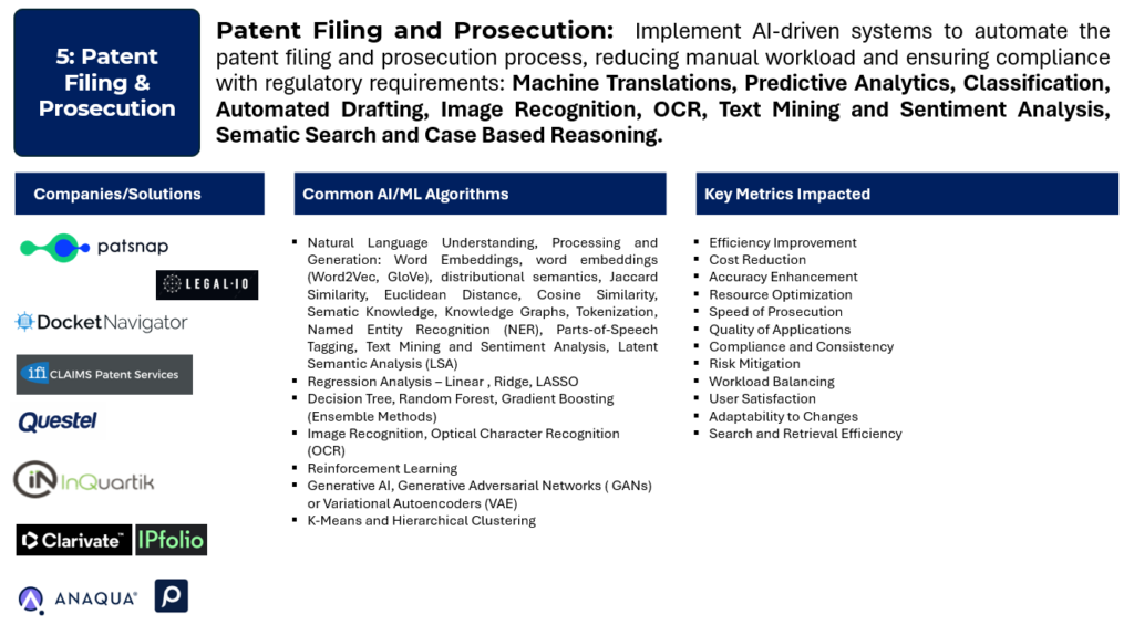 Automating patent filing and prosecution involves using AI/ML algorithms to streamline and optimize various tasks associated with the preparation, filing, and processing of patent applications. The combination of these AI/ML algorithms can contribute to the automation of various patent filing and prosecution tasks, reducing manual efforts, improving efficiency, and enhancing the overall quality of the patent prosecution process: Natural Language Processing (NLP):  Analyzing and understanding the natural language used in patent documents, including applications and responses. Automated parsing and extraction of relevant information from patent documents. Improving the efficiency of drafting responses to office actions. Machine Translation:  Translating patent documents between different languages. Facilitating the filing of international patent applications. Ensuring accurate translation of documents for patent prosecution in various jurisdictions. Predictive Analytics: Predicting outcomes or timelines in the patent prosecution process. Estimating the likelihood of success for a patent application. Predicting the time and resources required for prosecution. Classification Algorithms: Automatically categorizing patents into specific classes or subclasses. Streamlining the classification process during filing. Ensuring accurate categorization for efficient prosecution. Automated Patent Drafting: Generating patent application drafts with minimal human intervention. Speeding up the initial drafting process. Ensuring adherence to legal and formatting requirements.