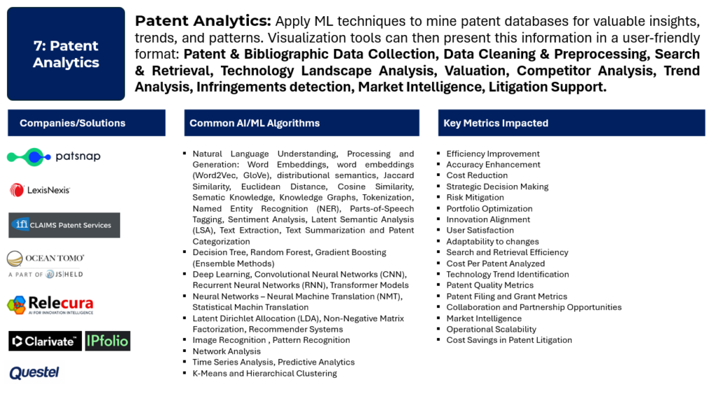 The combination of these AI/ML algorithms enables automation in various aspects of patent analytics, making it possible to process large datasets, uncover hidden patterns, and derive actionable insights for effective decision-making in the field of intellectual property: Natural Language Processing (NLP): Analyzing and understanding natural language text in patent documents. Extracting key information from patent texts. Categorizing and summarizing patent documents. Machine Learning for Classification: Automatically categorizing patents into specific classes or topics. Patent categorization for portfolio management. Prioritizing patents based on relevance. Clustering Algorithms: Grouping patents based on similarity or common features. Identifying technology trends within a patent portfolio. Organizing patents for easier analysis. Predictive Analytics: Forecasting future trends or values based on historical patent data. Predicting the future value of patents. Forecasting technology trends within a specific domain. Natural Language Generation (NLG): Generating human-readable text based on data analysis. Automated report generation summarizing patent insights. Drafting executive summaries or reports for stakeholders. Recommender Systems: Recommending actions or strategies based on patent data patterns. Suggesting potential licensing opportunities. Recommending patents for acquisition or divestment.