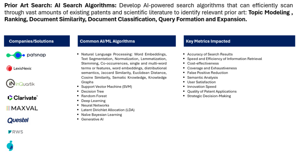Several companies and platforms leverage AI for prior art search in the field of intellectual property. Keep in mind that the landscape may have evolved since then, and new developments or companies may have emerged. Here are a few companies and platforms known for using AI in prior art search: IBM Watson for Drug Discovery: Application: IBM Watson for Drug Discovery uses AI to analyze scientific literature, clinical trial data, and other relevant sources to identify potential drug candidates and understand their prior art. PatSnap: PatSnap combines AI, machine learning, and big data analytics to provide a comprehensive IP intelligence platform. Their tools cover various aspects, including prior art search, patent analysis, and technology landscaping. Darts-ip: AI Integration: Darts-ip combines machine learning and legal expertise to enhance IP research and analytics, including prior art search and patent litigation data. Questel Orbit: AI Tools: Questel Orbit offers AI-driven tools for prior art search, patent analytics, and IP portfolio management. Questel provides IP solutions, and their platform integrates AI and machine learning for comprehensive prior art searches. It aims to enhance the efficiency and accuracy of searching and analyzing patent documents.  Thomson Reuters InnovationQ: AI Capabilities: Thomson Reuters suite employs AI to improve the efficiency of prior art searching and patent analysis. PatentSight: AI Analytics: PatentSight provides AI-driven patent analytics and prior art search capabilities, helping users gain insights into patent landscapes and technology trends. Google Patents: Machine Learning: Google Patents, while not exclusively AI-focused, utilizes machine learning algorithms to enhance patent search capabilities and identify relevant prior art. IP.com: Prior Art Database: IP.com offers a prior art database with advanced search capabilities, including semantic search and natural language processing. Relecura: AI-Powered Insights: Relecura uses AI to provide patent analytics, including prior art search, technology landscapes, and competitive intelligence. Omnity: Semantic Search: Omnity employs semantic search capabilities powered by AI to identify connections and relationships between documents, aiding in comprehensive prior art searches.